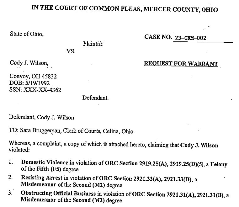 (1-4-23) Cody Wilson (30) Convoy was arrested on Monday on several charges including domestic violence, a 5th degree felony. The incident took place at the SR 703 trailer court, when Wilson made contact with his former girlfriend friend and is pregnant with his child.