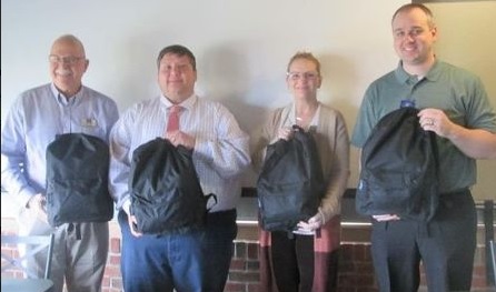 Kiwanis members Brad Brookhart, Kelly Westgerdes, and Dale Hart present the backpacks to Jason Cupp, the Social Services Administrator, who stands second from left.