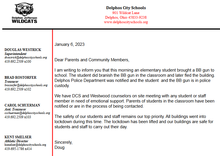 The Delphos Police Department was notified and and after locating the unidentified student and the BB gun they were taken into custody.