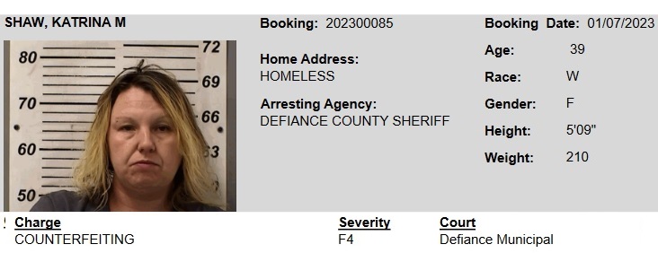Katrina Shaw (39) is presently being housed in the Corrections Center of Northwest Ohio on a 4th degree felony of counterfeiting. The other suspect is being held in the Paulding County Jail.