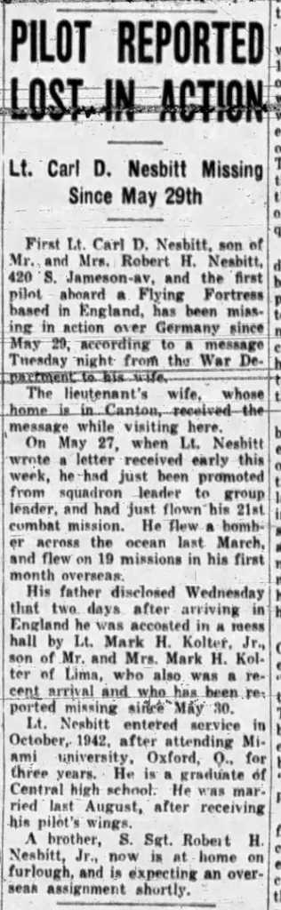 (1-16-23) Lima native First Lieutenant Carl D.Nesbitt will be buried in Annville, Pennsylvania on May 15th. The World War II pilot was positively identified in September of 2022..