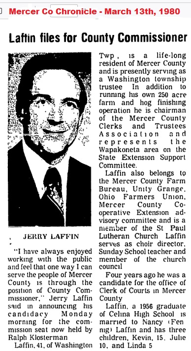 At a recent Mercer County Republican Party meeting Laffin made the announcement that after 11 terms that he would not run again. Laffin will have served over forty years as the Commissioner dating back to the 1980 election.