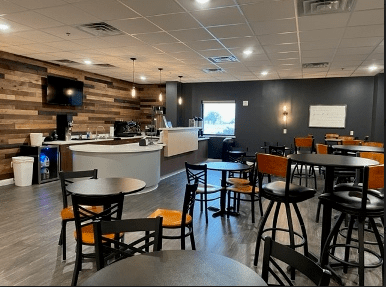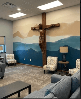 A lounge with the hand-carved cross made by member Tom Pryer many years ago. At the right is the new coffee gathering station. The expansion at New Horizon Community Church has enabled Kingdom Harvest Ministries to expand their classroom sizes.