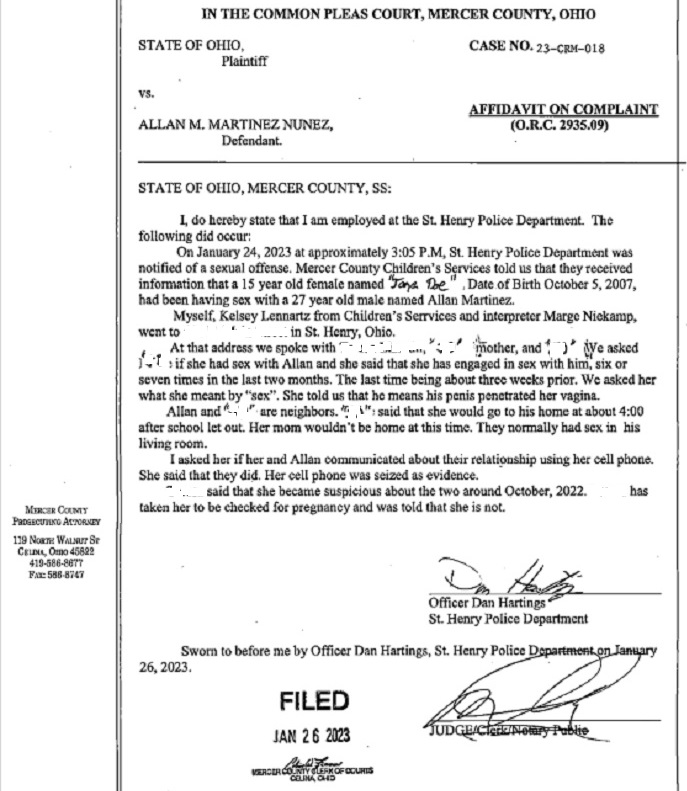 (1-27-23) Yesterday Allan Martinez Nunez (30) of St Henry has been charged by St. Henry Police, with six felony counts of unlawful sexual conduct with a minor. The minor was a 15 year old female, who said she had sex with Martinez Nunez six or seven times.The investigation began after information was reported to Mercer County Children’s Services