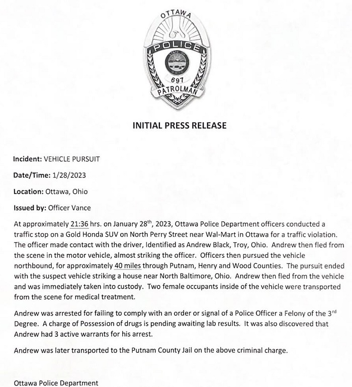 (1-29-23) Last night Patrolman Vance of the Ottawa Police Department on a traffic stop would have the situation end in a three county (Putnam, Henry, and Wood) 40 mile pursuit. The chase ended in North Baltimore after the suspect, Andrew Black (Troy), crashed his car into a house.