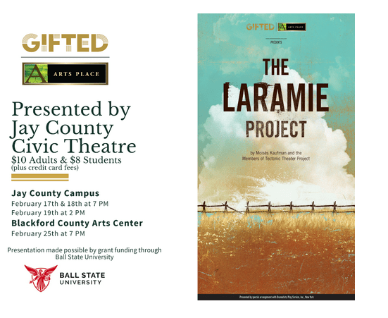 Performances of “The Laramie Project” are Feb. 17, 18 and 19 at the Jay County Campus of Arts Place and Feb. 25 at Blackford County Arts Center. Tickets are available at Arts Place, by calling (260) 726-4809 or online at myartsplace.org.