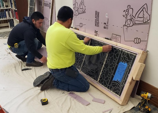 Workers from Associated Crafts & Willet Hauser Architectural Glass carefully pack the St. Clair window for transport to their facility in Minnesota.