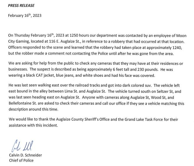 Arrests, local news Wapakoneta Police Looking For Robbery Suspect Date: February 16, 2023Author: statelinesportsnetwork 0 Comments (2-16-23) The Wapakoneta Police are looking for a robbery suspect who robbed Moon City Gaming. Share this: Click to share on X (Opens in new window) X Click to share on Facebook (Opens in new window) Facebook Like Loading... Related