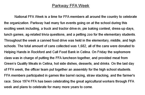 Community, local news, Uncategorized Parkway FFA Celebrates National FFA Week Date: March 10, 2023Author: statelinesportsnetwork 0 Comments Share this: Click to share on X (Opens in new window) X Click to share on Facebook (Opens in new window) Facebook Like Loading... Related