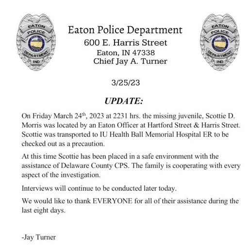 (3-25-23) The Eaton Indiana Police Department reported this morning that 14 year old Scottie Morris had been found. He has been moved to a safe location with the Delaware County CPS. As a precaution he was taken to a nearby Emergency Room for evaluation.