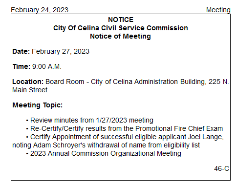 According to a public notice posted on February 23rd Lange was certified on February 27th by the City of Celina Civil Service Commission.