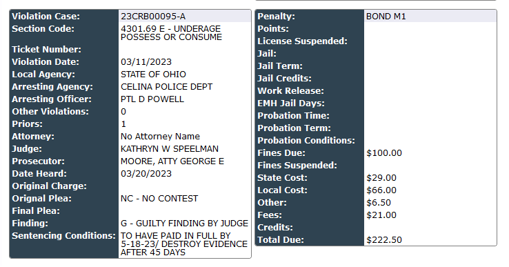 The hearing was held on 3-20-23 with the individual claiming ‘ no contest‘ and a a guilty charge by the Judge Speelman was filed and $222.50 in total fines were issued.