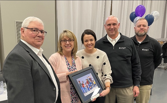 (L-R): ACBDD Board President Tom Fleming and Superintendent Theresa Schnipke present Cindy Pottkotter, Chris Monnin and Jason Fleming of Garmann Miller with the 2023 President’s Award Thursday, March 30, during the annual Partnership Luncheon in Lima.