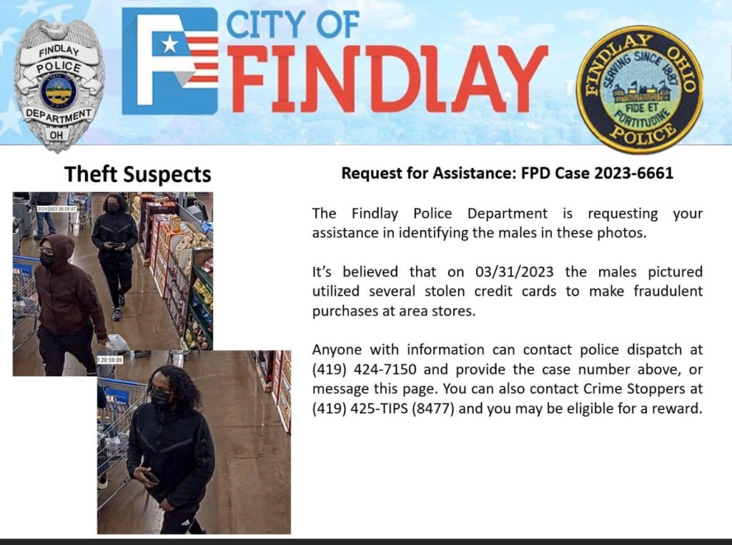 (4-6-23) The Findlay Police Department are looking for two male suspects who used fraudulent credit cards to make purchases.