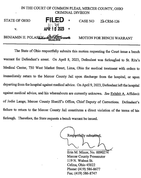 (4-11-23) Local law enforcement are searching for an inmate, Benjamin Polasky (40), who was on medical furlough at Mercy Health – St. Rita’s Medical Center and was waiting to be transported back to the Mercer County Adult Detention Facility.