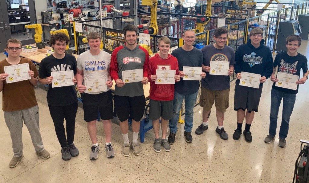 (4-17-23) Seniors, in Tri Star’s two-year Robotic, Electronics, and Computer Technologies (REC Tech) program, have completed 60 hours of specialized robotics training to earn their FANUC Material Handling Certification. They are now certified to program FANUC robots, a valuable skill in today’s job market. Their REC Tech Instructor, Jerry Kohnen, is a certified FANUC instructor.