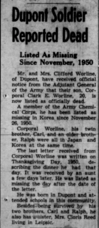 FORT KNOX, Ky (5-10-23) . – The remains of a Soldier killed during the Korean War will be interred May 19 at Fairview Cemetery, Dupont, Ohio. Graveside services for Army Cpl. Clark E. Worline will be performed by Love-Heitmeyer Funeral Home, Fort Jennings, Ohio, preceding the interment.