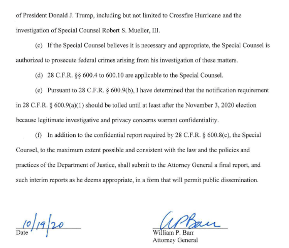 On October 19, 2020, John Durham was appointed by Attorney General William Barr to serve as the Special Counsel by the order below.