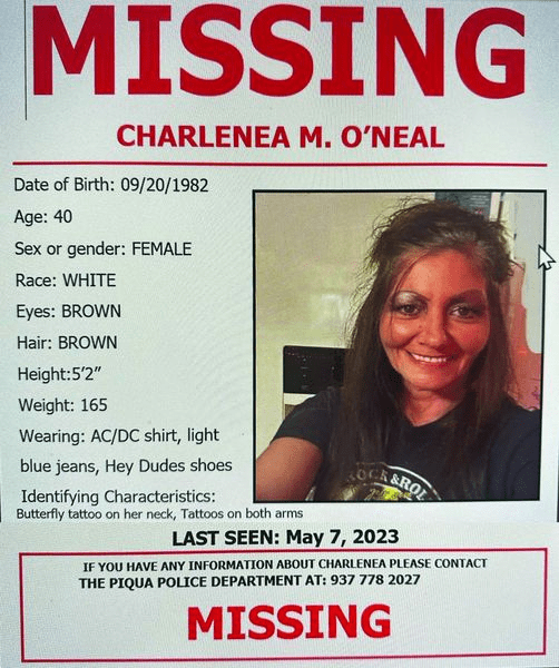 (5-17-23) The body of Charlenea O’Neal (40) of Piqua was found in Shelby County outside of Port Jefferson.