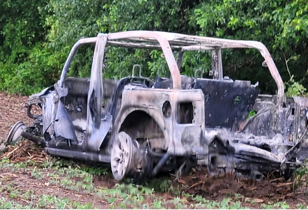 A vehicle was located in the woods that was on fire. Later investigation revealed that the vehicle was a 2021 Jeep Wrangler that had been reported stolen out of Allen County Indiana.