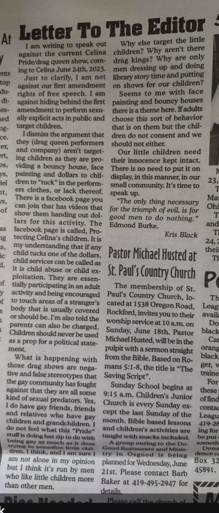 (6-18-23) A new Facebook group was started recently to discuss the upcoming Small Town Pride-Celina Drag Show will take place June 24, 12-7 p.m. at Lakeshore Park this weekend. Needless to say it is quite active.