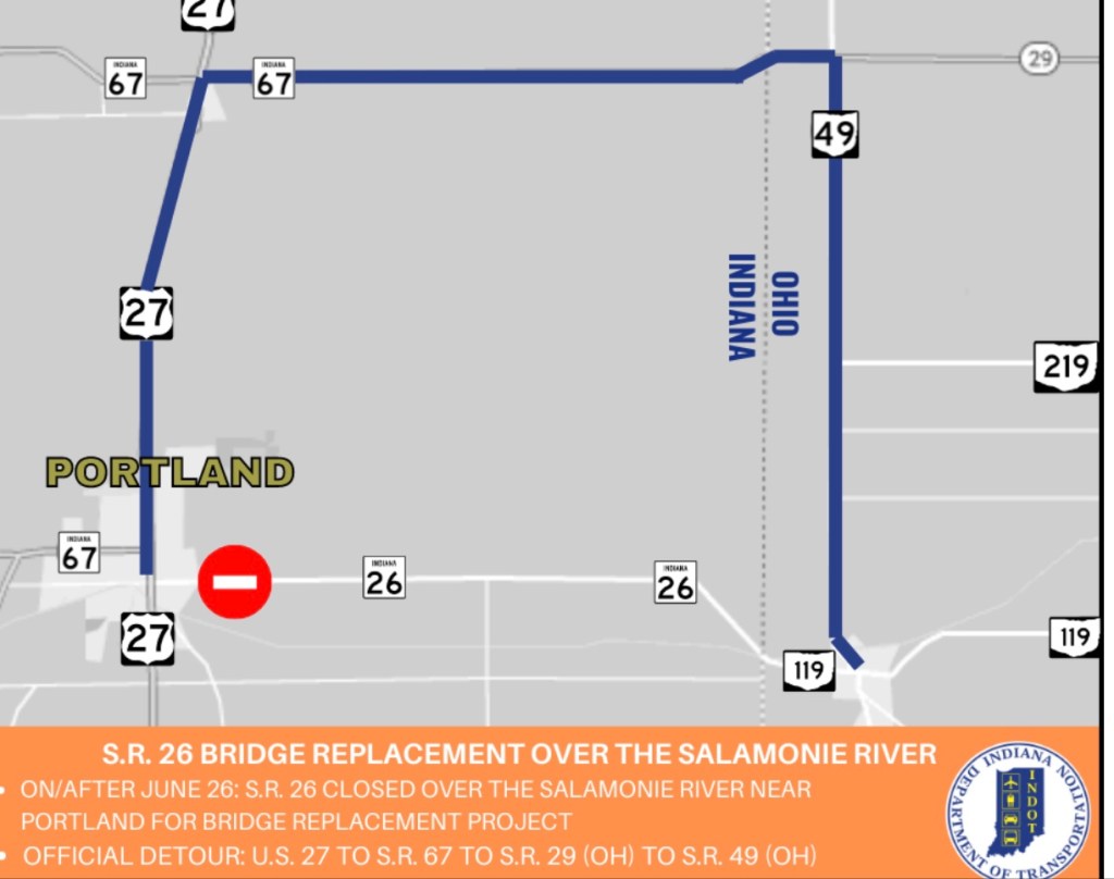 (6-26-23) JAY COUNTY, Ind. – Indiana Department of Transportation contractor Milestone Contractors LP plans to begin work next month to replace the S.R. 26 bridge over the Salamonie River in Portland.