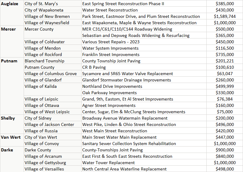 Local projects included in this allocation, according to information provided by the OPWC, are: