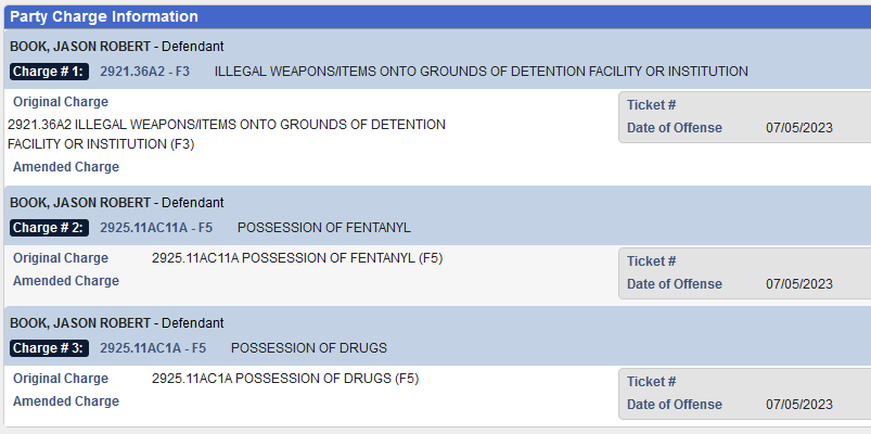 (7-10-23) Jason Robert Book (50) Wapakoneta has been charged with felony counts of bringing Illegal weapons and items onto the grounds of a detention facility or institution, possession of drugs and possession of fentanyl.