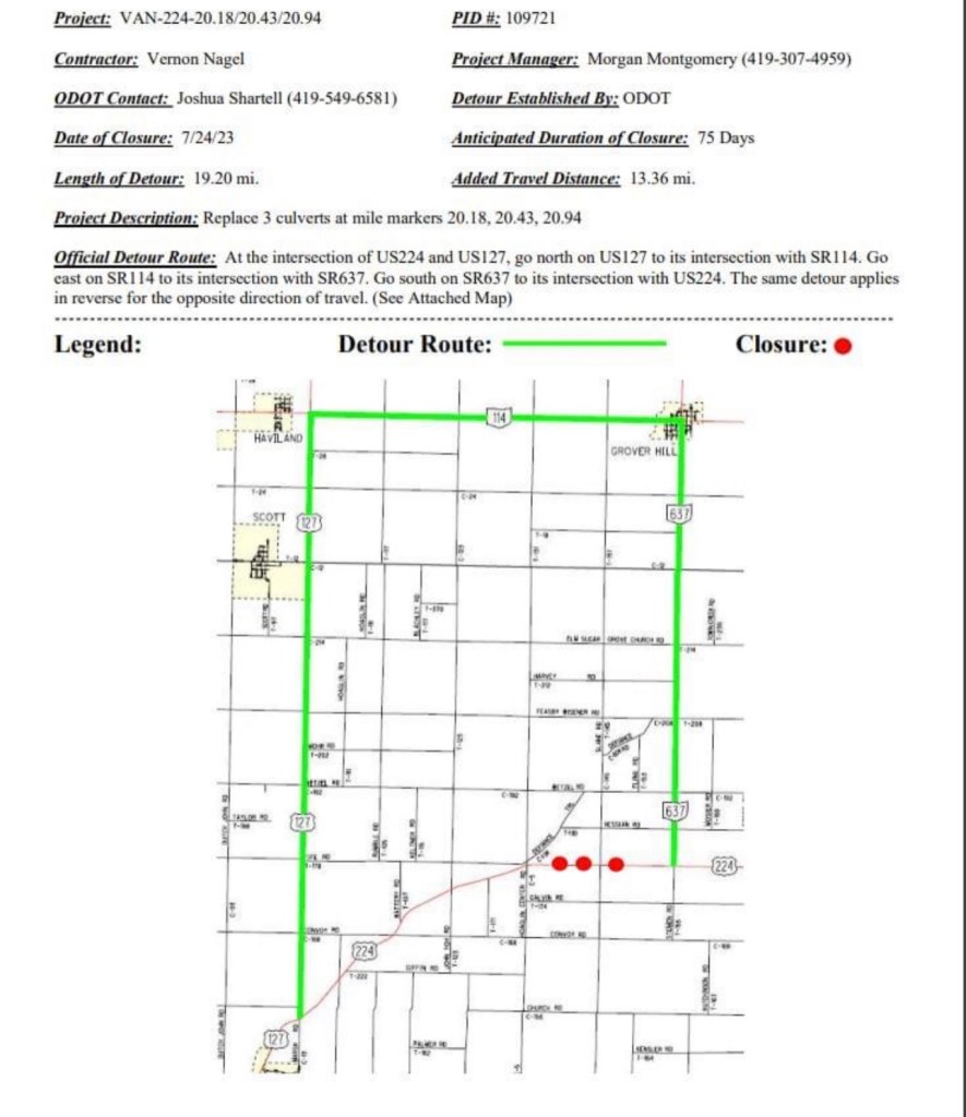 DETOUR: At the intersection of US224 and US127, go north on US127 to its intersection with SR114. Go east on SR114 to its intersection with SR637. Go south on SR637 to its intersection with US224. The same detour applies in reverse for the opposite direction of travel. (See Attached Map)