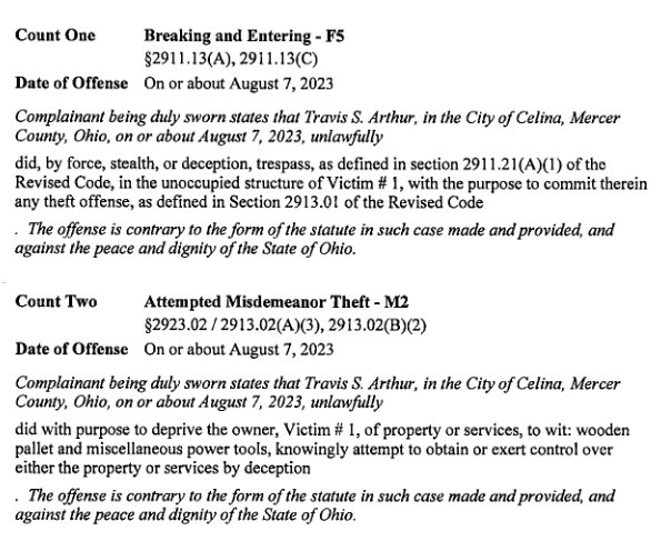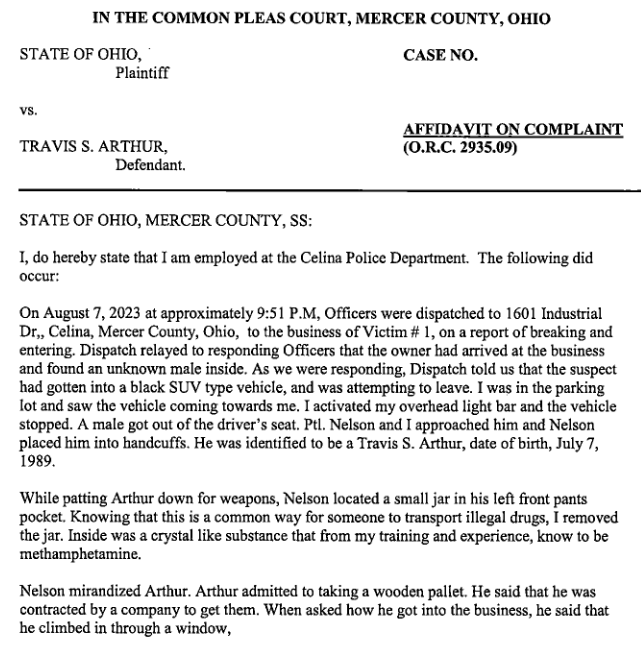 (8-10-23) A Waverly, West Virginia man, Travis Arthur (34), was arrested on Monday August 7th and charged with breaking and entering, misdemeanor theft, criminal trespass and aggravated possession of drugs after and incident in Celina’s Industrial Park.