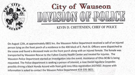 Wauseon Police Chief Kevin Chittenden said they were called to a home Saturday morning where they found Edwin Aguilera (64) dead from several stab wounds. A woman also was injured and taken to a hospital in Toledo.An arrest warrant charging Aguilera’s son with murder and felonious assault was issued