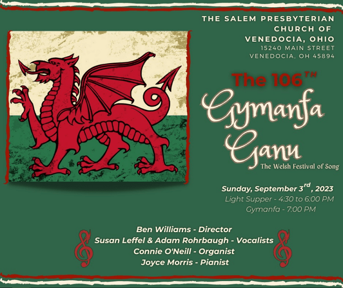 Historically held on Labor Day Sunday, a light supper will be served from 4:30-6 p.m. for a free-will donation. The Gymanfa will begin promptly at 7 pm. All are welcome to experience a night like no other with the church full of voices raised glorifying the Lord, joyful reunions of friends and family and celebration of the unique Welsh heritage in music in the village of Venedocia. Salem Presbyterian Church is located at 15240 Main Street – Ohio 116 in Venedocia.