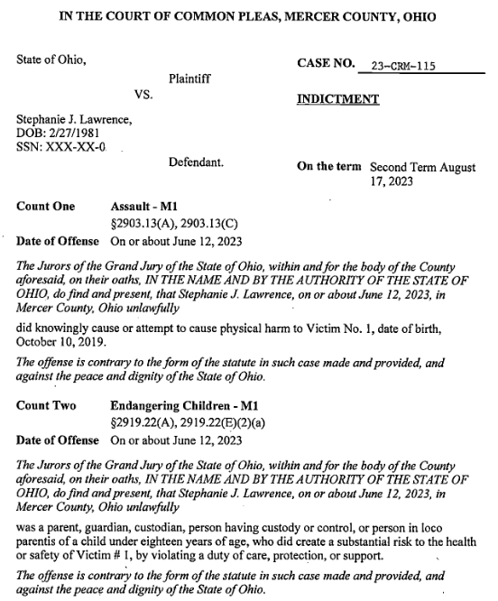 Lawrence of St Marys has been charged with assault and endangering children and is due to appear in Mercer County Common Pleas Court on Wednesday, August 30th for her initial appearance.