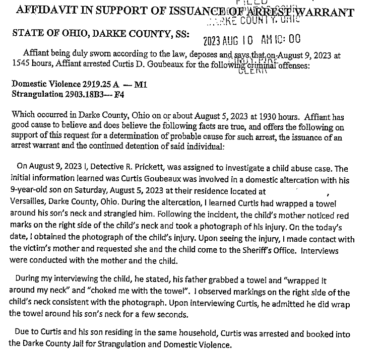 (9-4-23) — Curtis Goubeaux (42) of Versailles, was indicted on August 25th on charges of domestic violence (1st degree misdemeanor) and strangulation (4th degree felony) in the Darke County Municipal Court.