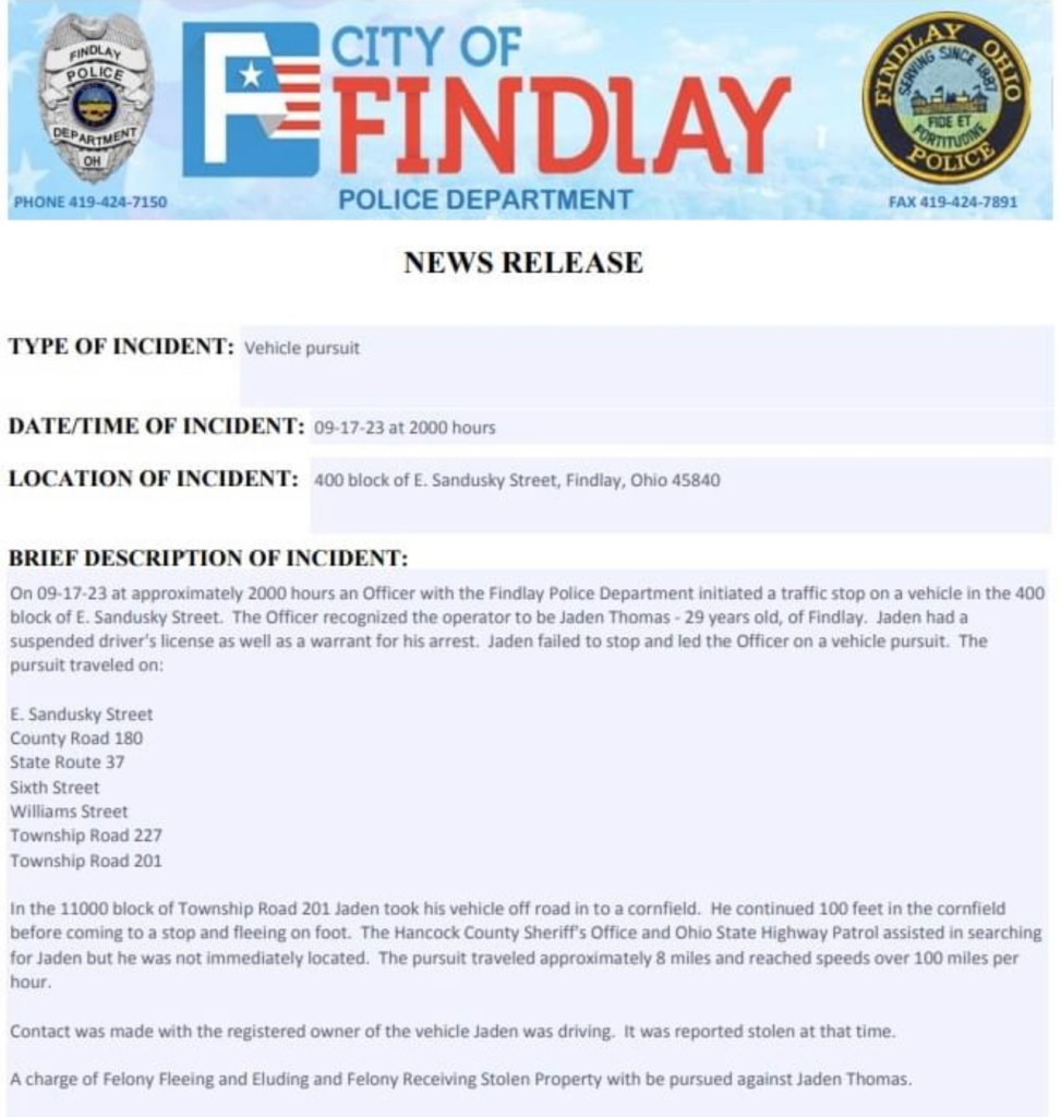 (9-18-23) Jaden Thomas (29) Findlay, in a stolen car, led the police department on a pursuit with speeds of up to 100mph last night that ended in a cornfield and an escape by Thomas.
