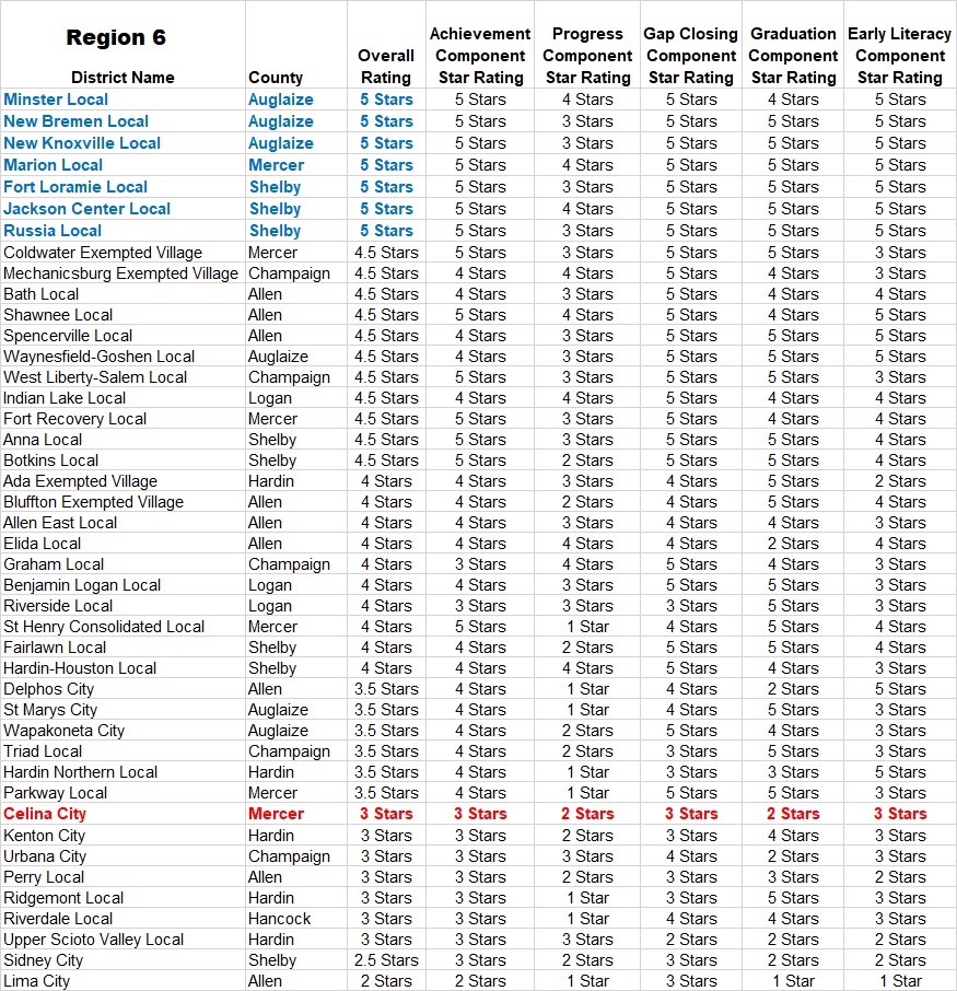 Celina’s 3 out of 5 star rating puts them at the bottom of Stateline area schools and in Region 6.