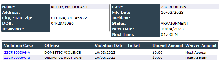 10-4-23–Nicholas Reedy (37) of Celina was arrested yesterday by Celina Police after an alleged domestic violence incident.
