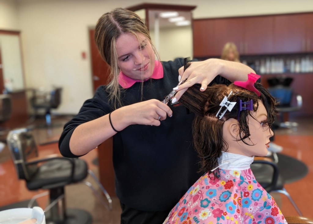 Cosmetology senior, Alayna Wannemacher (Van Wert), practices her cut and styling techniques prior to the opening of the Avantage Salon. To make reservations, please call 419-238-5411 x2003.