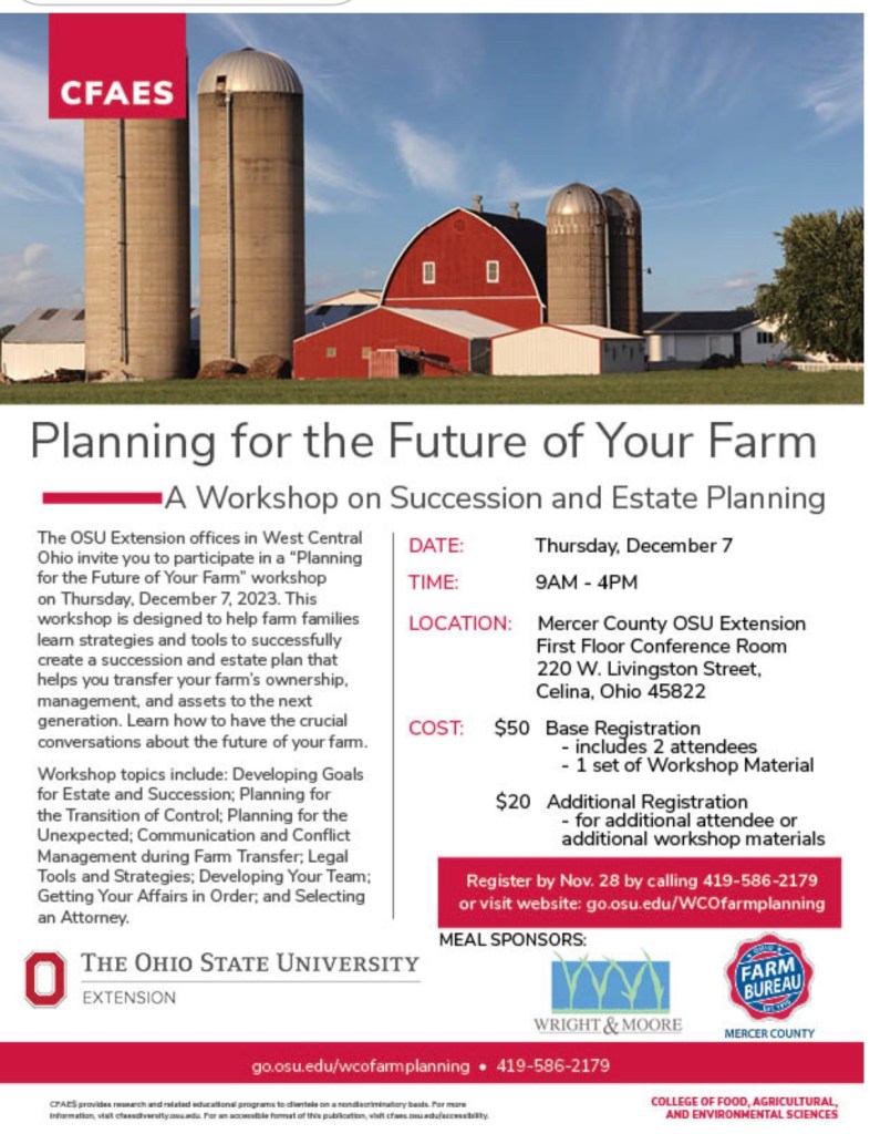 Celina (10-17-23) – The Mercer County OSU Extension is hosting a “Planning for the Future of Your Farm” workshop on Thursday, December 7, 2023. This workshop is designed to help farm families learn strategies and tools to successfully create a succession and estate plan that helps you transfer your farm’s ownership, management, and assets to the next generation. Participants will learn how to have the crucial conversations about the future of your farm.