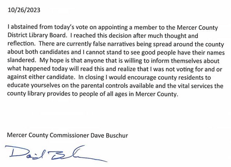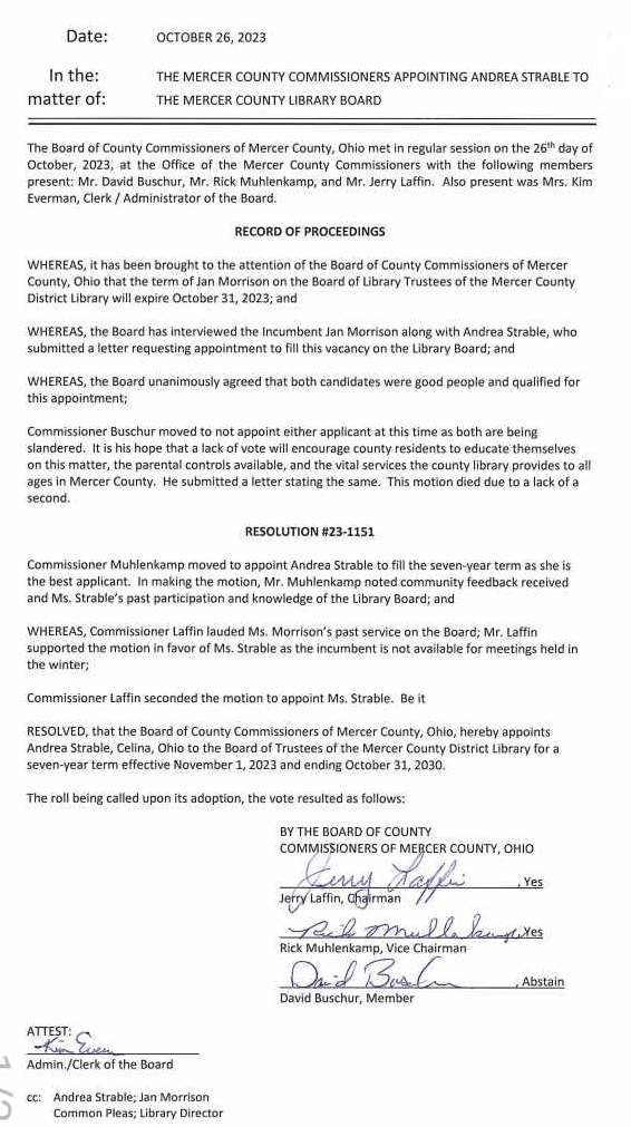 (10-27-23) Yesterday Mercer County Commissioners met and made a new appointment to serve on the Mercer County Library Board of Trustees. Newcomer Andrea Strable was appointed to replace Jan Morrison whose current term ends next week.