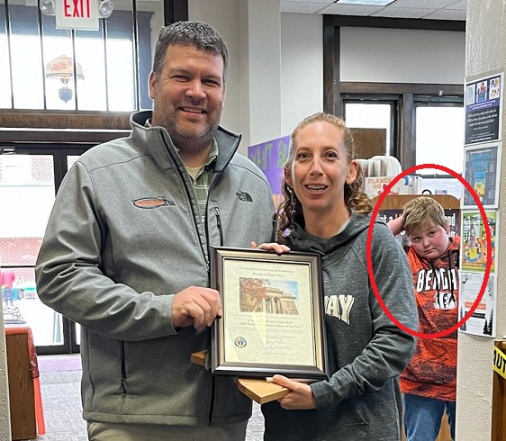 Commissioner Dave Buschur presents Shelley with a Proclamation