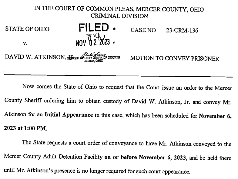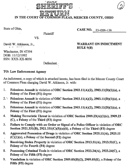 (11-6-23) Today David Atkinson Jr. of Winchester, Indiana was removed from the Augalize County Jail and booked into the Mercer County Adult Detention on 9 different felony charges.