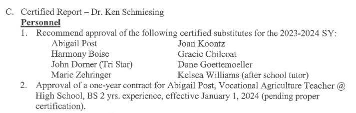 During the October BOE meeting Post was hired as a certified substitute and was also approved as the new Vo Ag instructor.