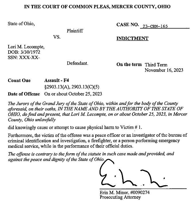(11-29-23) Lori Lecompte was indicted on November 16th on a 4th degree charge of assault (peace officer) that took place on October 25th . She was booked into the Mercer County Adult Detention Facility yesterday with no bond. She is waiting for a Mercer County Common Pleas Court hearing.