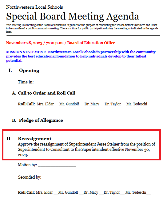 “The Northwestern Local School District Board of Education wishes to make it clear that this decision is not a result of any professional misconduct or impropriety and that the transition was a mutual agreement between the board and Mr. Steiner.
