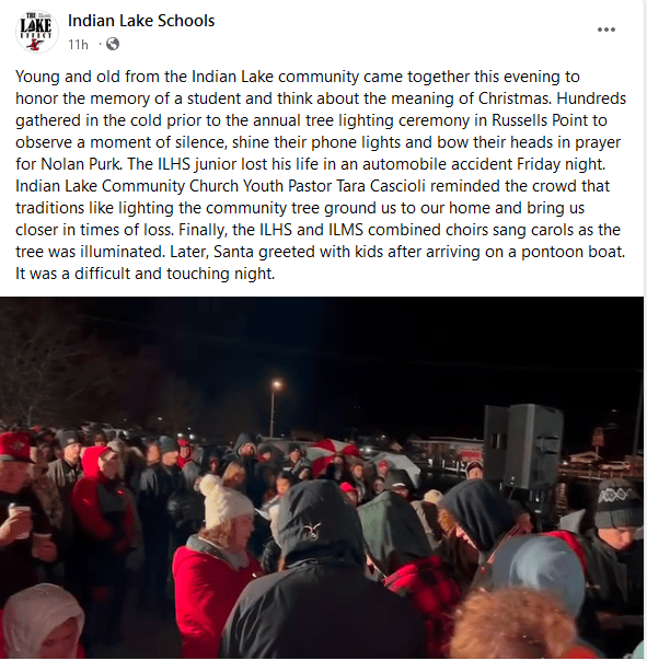 Members of the Indian Lake community came together Sunday evening to honor the 17-year-old Indian Lake High School junior before the annual tree lighting ceremony in Russells Pont. They observed a moment of silence, shined their phone lights, and bowed their heads in prayer.