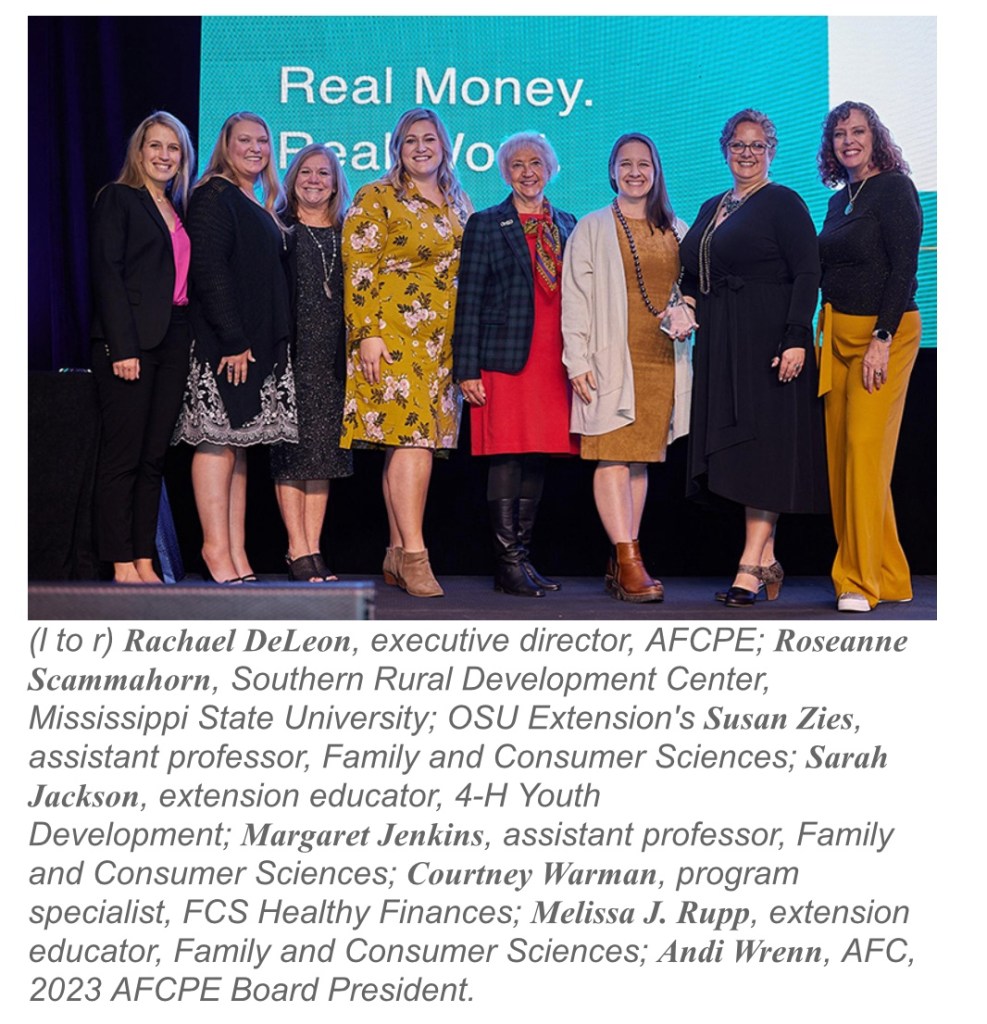 (12-1323) During the annual Association for Financial Counseling & Planning Education (AFCPE®) Symposium in New Orleans, a team of Ohio State University Extension educators, which included Dr. Roseanne Scammahorn, former OSU Extension FCS Educator in Darke County,accepted the 2023 Outstanding Educational Program Award on behalf of The Ohio State University. The award recognizes the exceptional work of Real Money. Real World. an OSU youth financial literacy program.