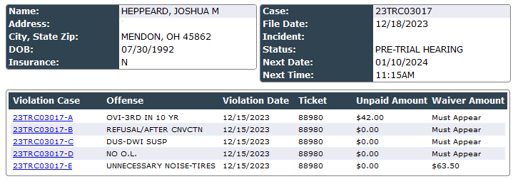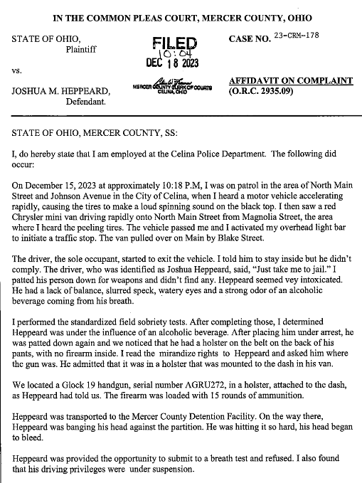 12-18-23) Joshua Heppeard (31) Mendon was arrested on Friday night by the Celina Police.