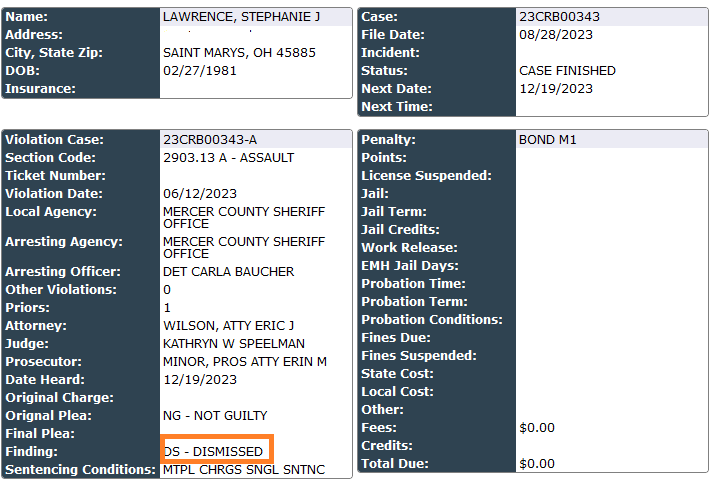 (12-23-23) Stephanie Lawrence (42) of St Marys, who worked at Victorum Learning Center in Celina, was recently sentenced in Celina Municipal Court to 10 days in jail with time suspended on the condition that she has no similar convictions or contact with the victim.