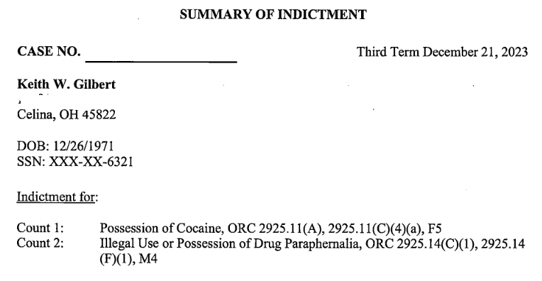(12-27-23) Keith Gilbert (52) Celina was indicted recently in Mercer County Common Pleas Court on two drug charges.